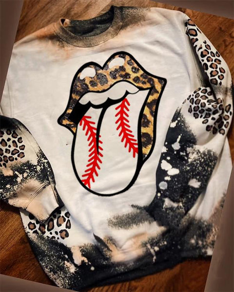Ballpark Mom Baseball And Leopard Lip And Tongue Bleach Sweatshirt